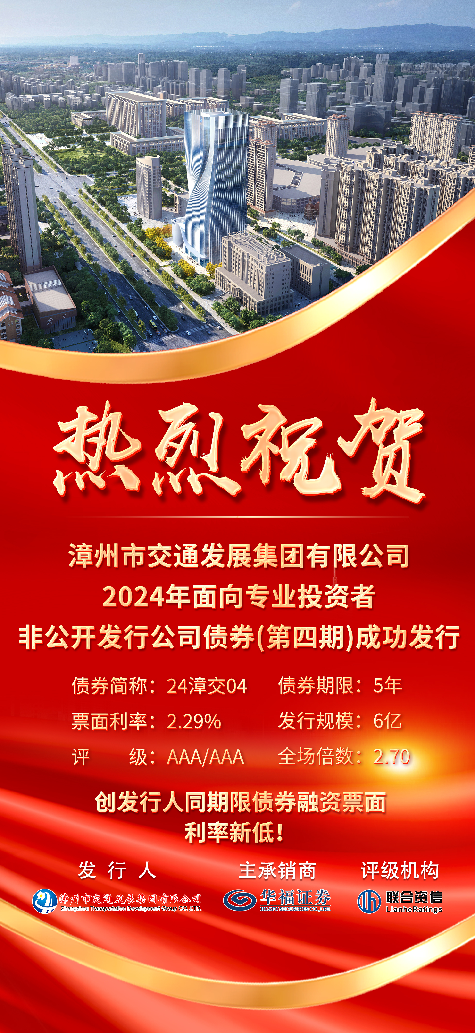 本期债券为漳州交通集团获评AAA主体信用评级后的首次发行,由华福证券作为独家主承销商,期限5年,发行规模6亿元,发行利率为2.29%,全场倍数高达2.70倍,创下漳州交通集团同期限债券融资票面利率新低。