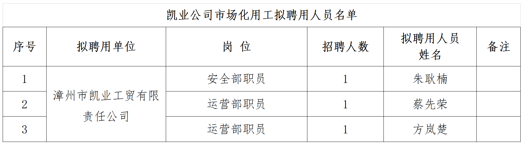 根据《漳州市交发工贸集团有限公司所属凯业公司市场化用工人员招聘公告》相关规定,经报名、资格审查、面试、背景调查、体检、政审等程序,现将拟聘用3名人员予以公示,具体名单如下: