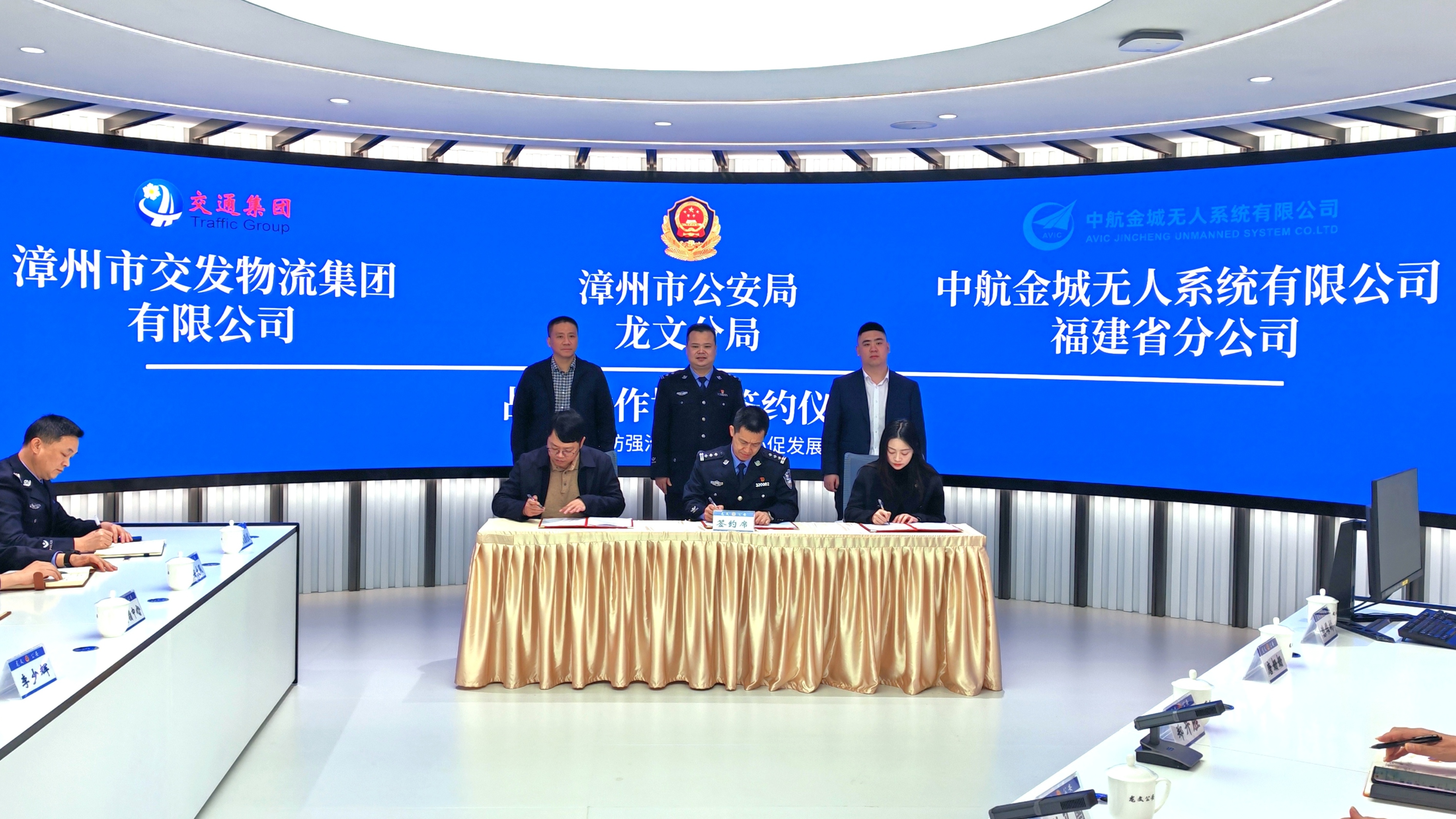 交发物流集团党总支书记、董事长刘向东,中航金城无人系统有限公司福建省分公司总经理助理何沛霖,漳州市公安局龙文分局局长陈阿伟等出席仪式。